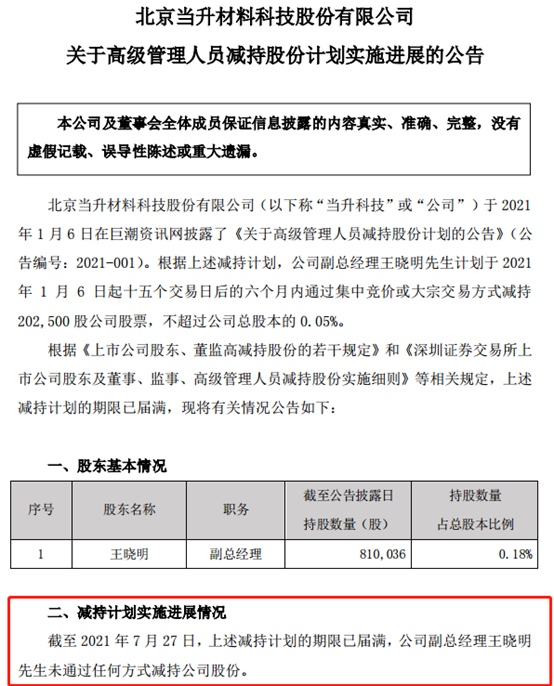 在此之前,今年1月6日,公司副總經理王曉明也曾經計劃減持,不過在減持計劃的期限屆滿時,王曉明未通過任何方式減持公司股份,本次公告的擬減持股數與當時計劃減持的數量一致。